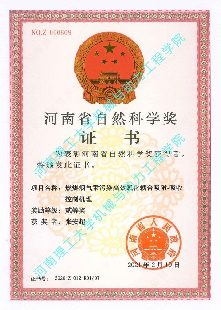 █ 河南省自然科学二等奖:燃煤烟气汞污染高效氧化耦合吸附-吸收控制机理,2020年